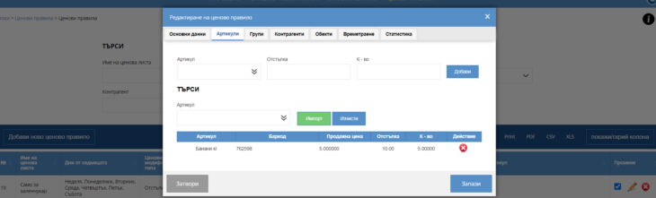 В посочения в конкретния прмер от снимките ще получим следния резултат: когато бъдат маркирани над 5 килограма банани автоматично ще им бъде начислена отстъпка от 10 %. Това ценово правило ще работи в Уеб и в ПОС. Системата позволява добавянето на повече от един артикул в листа и възможност за задаване уникални параметри за всеки един артикул. При опит да се въведе един артикул втиро път в списъка системата ще изведе съобщение , че този артикул вече в включен в списъка с две възможности : да се откажете от въвеждането на артикула или да презапишете данните , които вече сте въвели. Във всеки един момент имате възможност да премахвате или да добавяте артикули в ценовото правило. Това ценово правило работи в прогресия т.е. системата позволява да се добави ново ценово правило, което да даде 15% отстъпка при закупуване на 10 килограма банани.