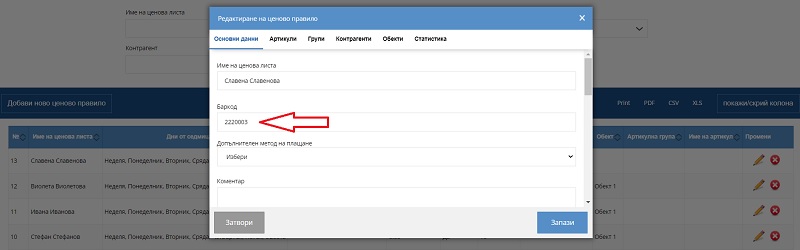 Баркода, за който става въпрос в статията се въвежда в ценовото правило