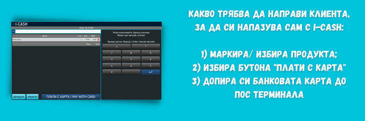 Ние от I-CASH, разработихме версия на POS софтуер за самообслужване, която позволява на клиентите интуитивно да пазаруват сами.