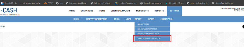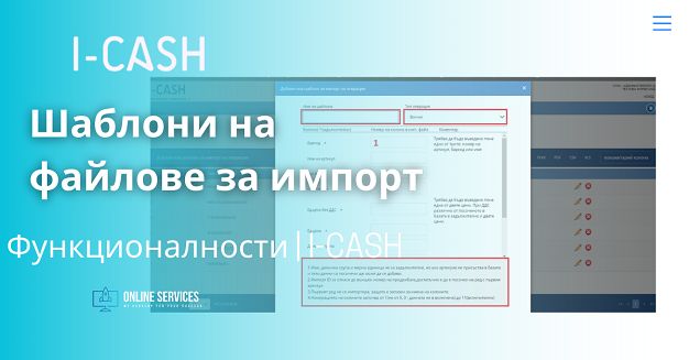 Всяка една операция в софтуера може да бъде въведена със файл. Заложени са основни шаблони на тези файлове в програмата. Ако нези шаблони не отговарят на изискванията на клиента има възможност те да бъдат променени. Редакция на шаблони на файлове за импорт е достъпна от меню Настройки – Импорти – Шаблони за импорт на операции.