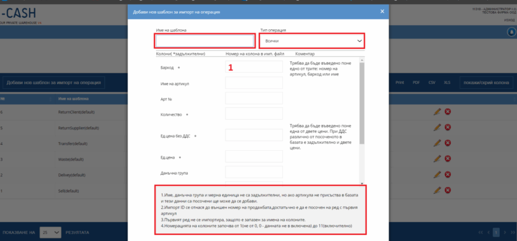 Ако се отвори въпросната страница ще се визуализира списък с всички шаблони за импорти. Имате възможност да ги редактирате или да създадете нови. В интерфейса системата позволява да „нареждате“ колоните т.е. в файла който импортвам в първата ми колона е баркод. В полето срещу баркод въвеждаме единица. По този начин подготвяме всички колони коя на коя ще отговаря. Въвеждате име на шаблона и избирате към коя операция се отнася. Моля обърнете внимание, че част от колоните са задължителни.