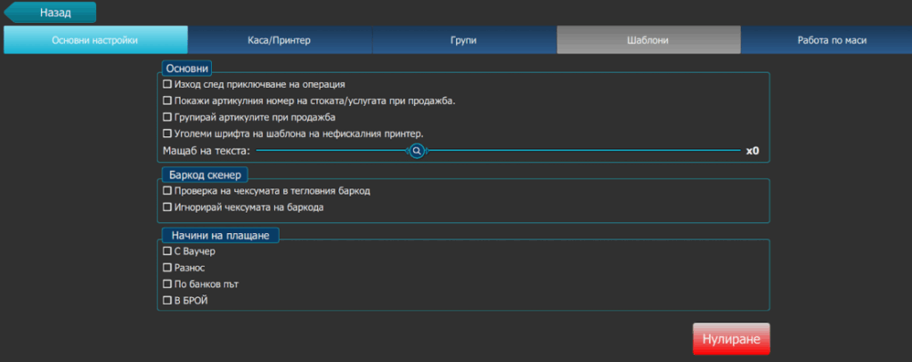- Големи шрифта на шаблона на нефискалния принтер – увеличава големината на буквите на текста , който се принтира през нефискални принтери (кухненски принтер).