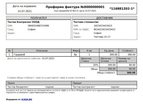 При създаване на Проформа фактура след завършване на операцията и натискане на бутона “Печат на документи” генерирате документ, който може да бъде разпечатан или изпратен по електронна поща, а самата продажба се запаметява в състояние на отворена операция, която може да бъде завършена с друг тип документ.