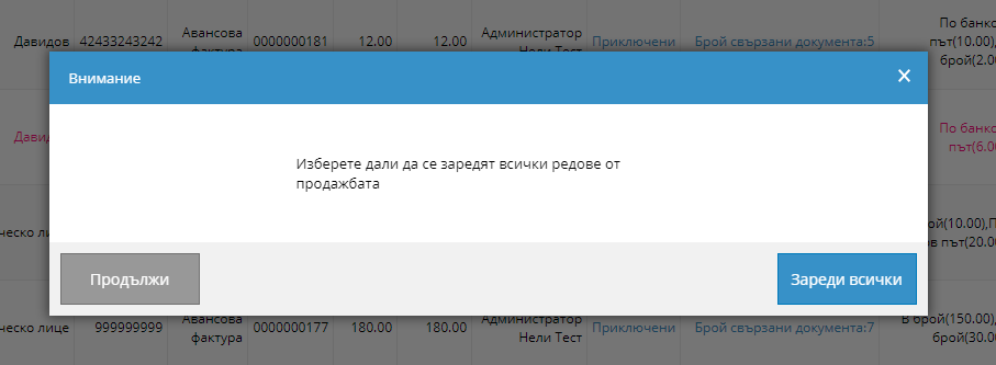 След като е създадено вече кредитното известие, можете да направите и рекламацията към самата продажба. Рекламацията се прави от колона Промени и Нова рекламация от клиент (обърната синя стрелка). При генерирането ви пита дали да зареди всички артикули, или не. Ако изберете да не се зареждат, то документът ще бъде празен и ще се наложи да ги въвеждате ръчно.