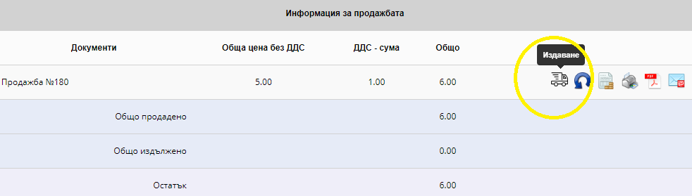 За да върнете в склада съответното изписано количество, избирате икона „Прегледай“, стигате до края на документа и избирате „Издаване“ (иконата, чието изображение представлява камионче). Въвеждате количеството, което искате да върнете отново в склада.